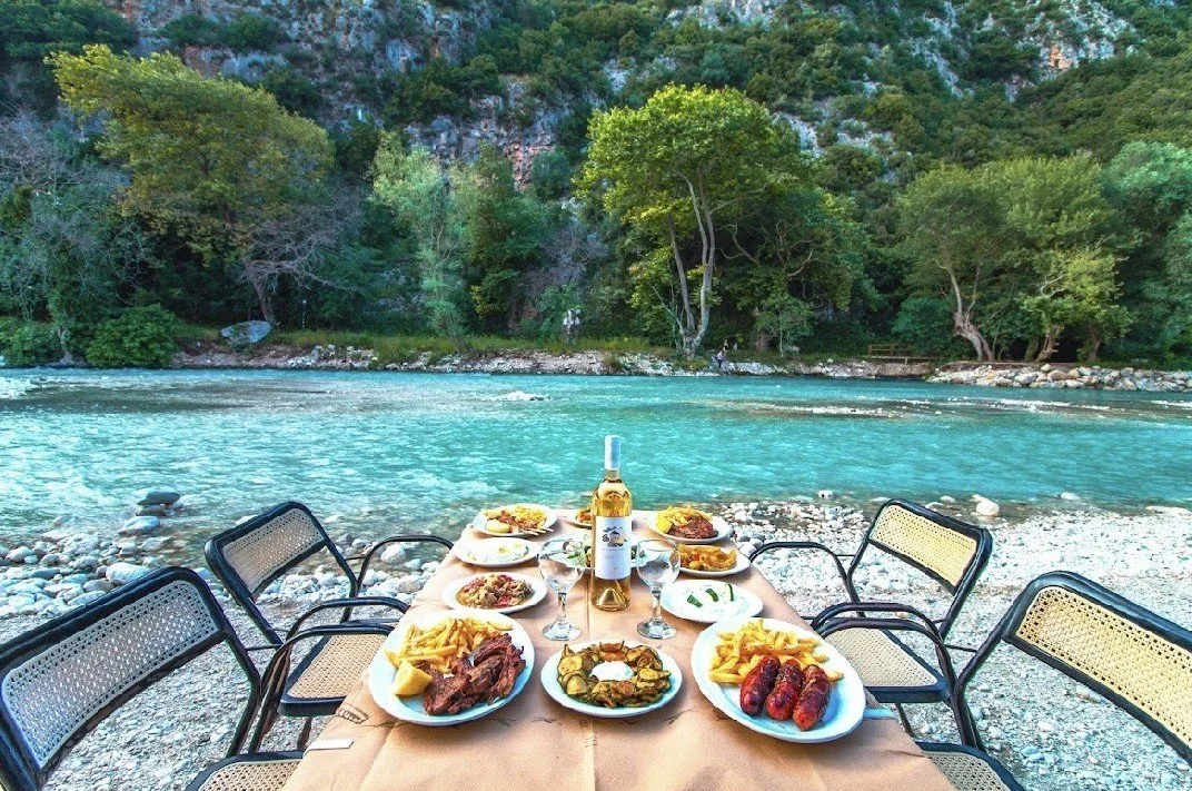 We stay at the beautiful Piges Hotel, located directly at the springs of the Acheron River.