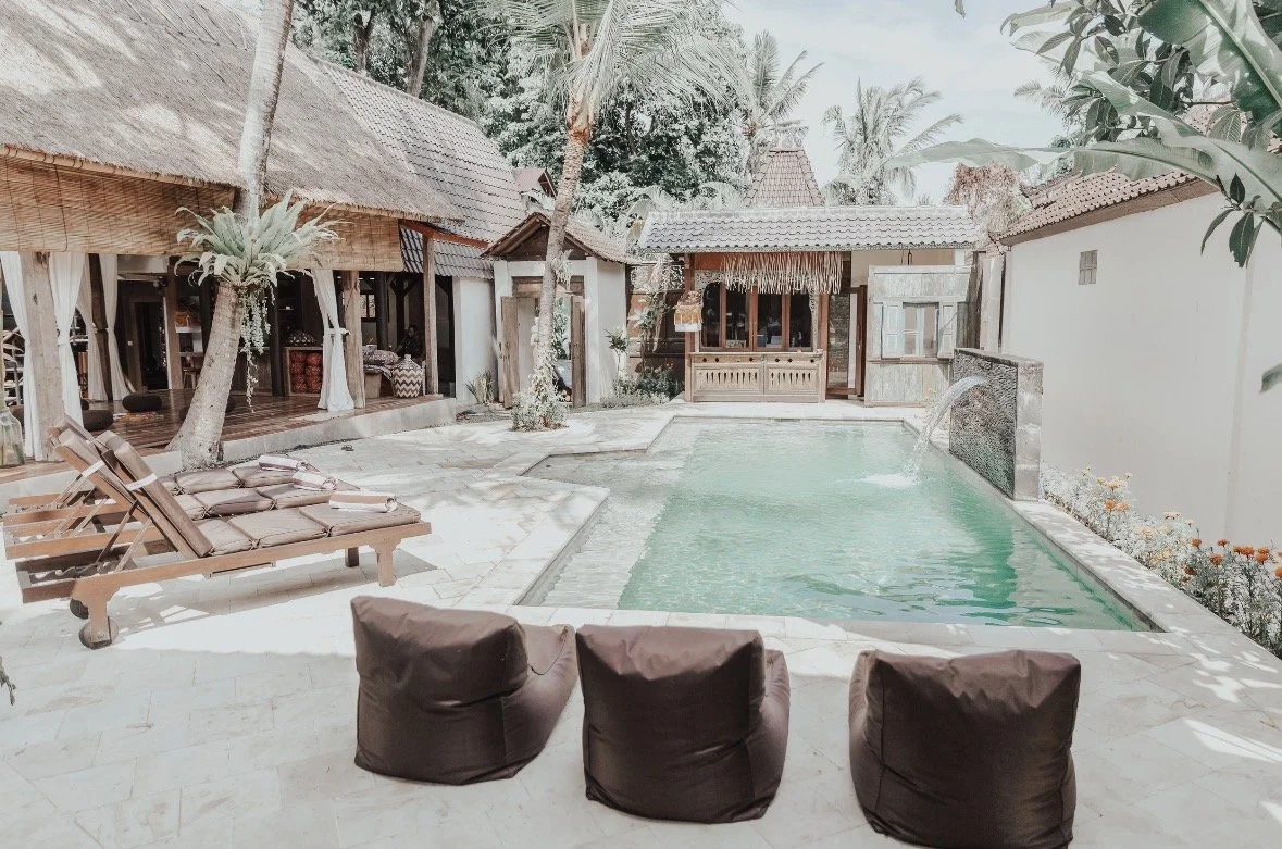 On Lembongan, we stay at Pondok Baruna Frangipani, a cool resort with bungalows and a pool, just steps from the beach and the ocean. Here life becomes simpler, barefoot, and close to the elements – perfect for integration and quiet presence.